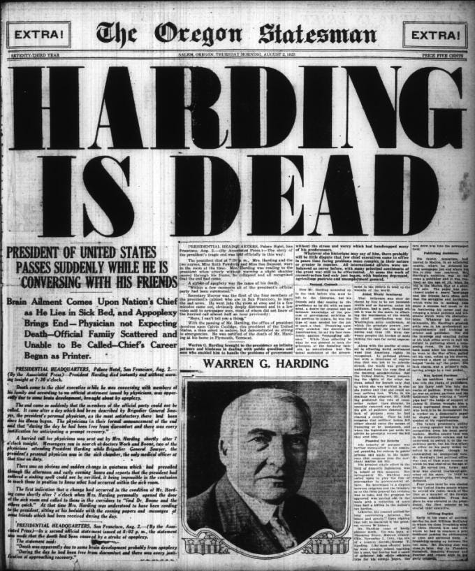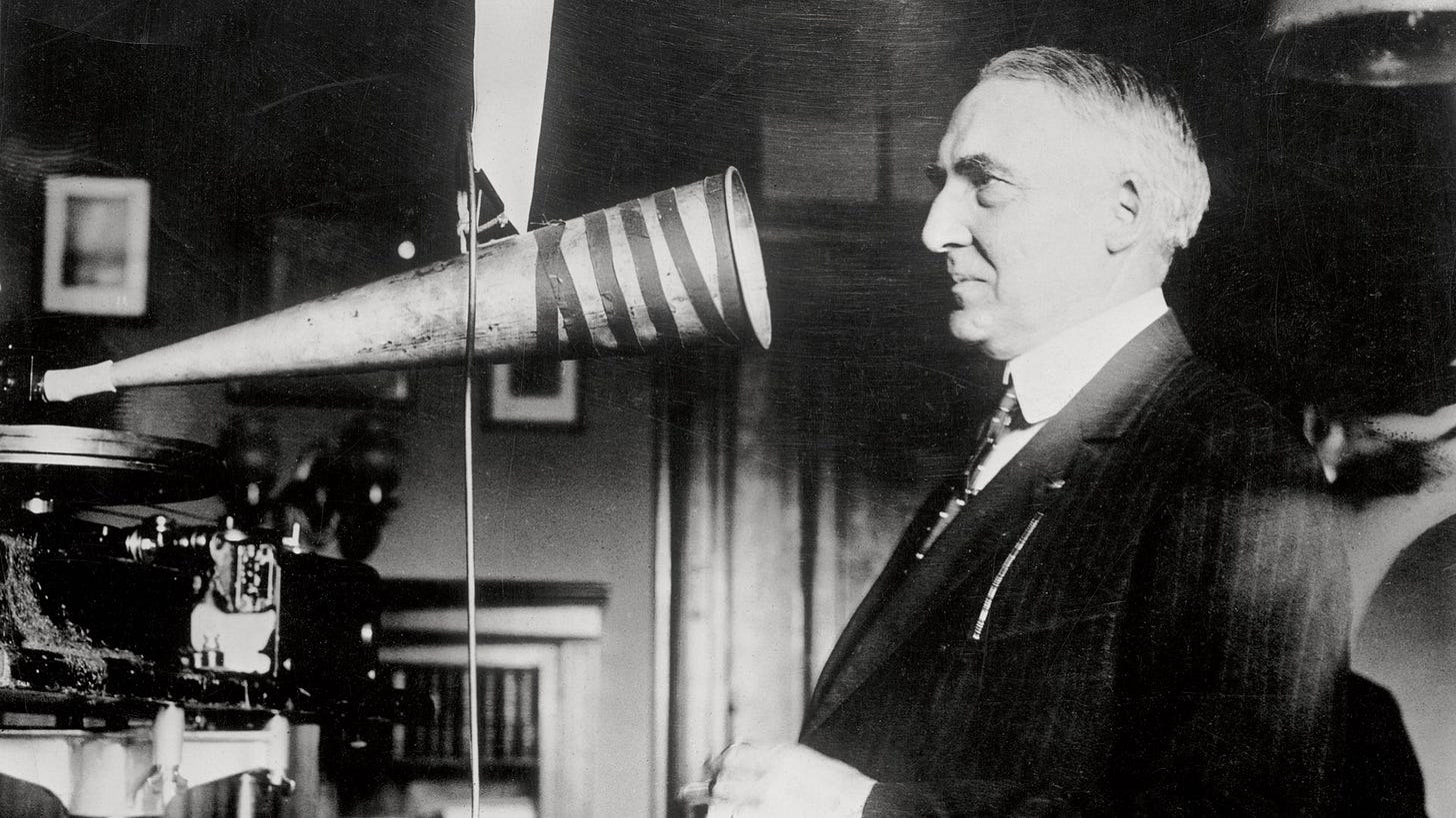 The Harding campaign was also the first one where telemarketers were paid to call people up at home and talk to them about a candidate. I’ve often wondered who specifically I have to blame for the six emails and four texts I’ve received from the DNC while writing this very newsletter, and it’s good to know that the answer is Warren G. Harding.