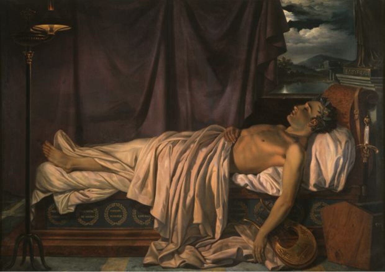 To the best of my knowledge, Byron did not rob any ancient graves while traveling through Greece, Albania, and Turkey in the early 1810s. He did, however, swim the Hellespont, seduce a 12-year-old girl, and have so much gay sex that even he was exhausted. But Byron’s fascination with the Mediterranean would continue to problematically show up for the rest of his life, resulting in pictures like this: