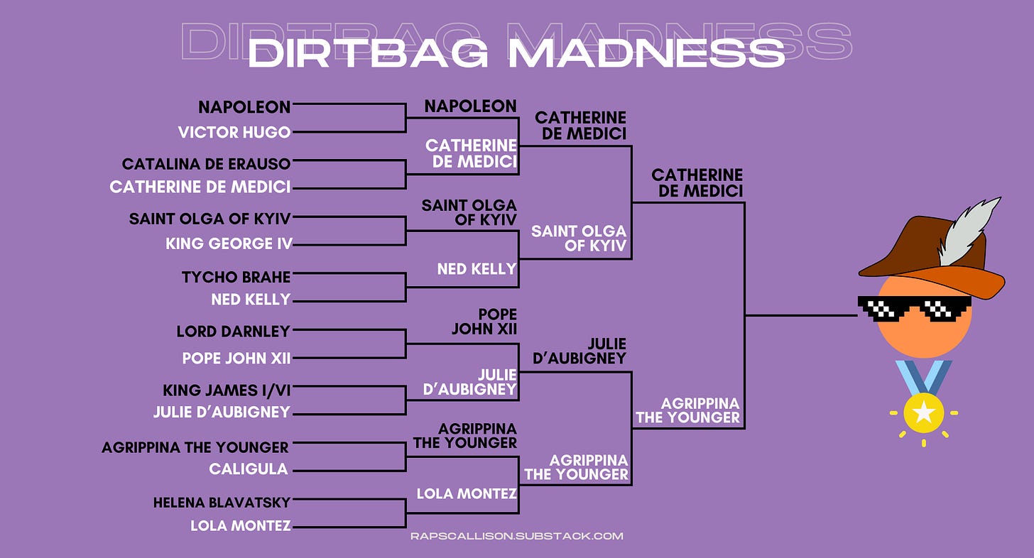 Next, we have reached the CHAMPIONSHIP ROUND OF DIRTBAG MADNESS! Paid subscribers have whittled us down from your selected eight victors to two contenders vying for the crown of Dirtbaggiest Historical Figure: