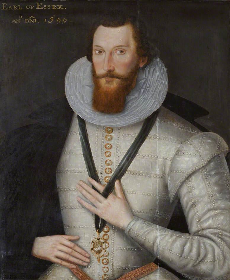 In addition to sashaying around court showing off his calves, Essex also held a military post—I have to assume because Elizabeth secretly wanted his head blown off but didn’t want to do it herself. He fucked around in England through most of the 1590s, uselessly engaged in not one but two dumb battles with the Spanish Armada. Then, he took that show on the road.