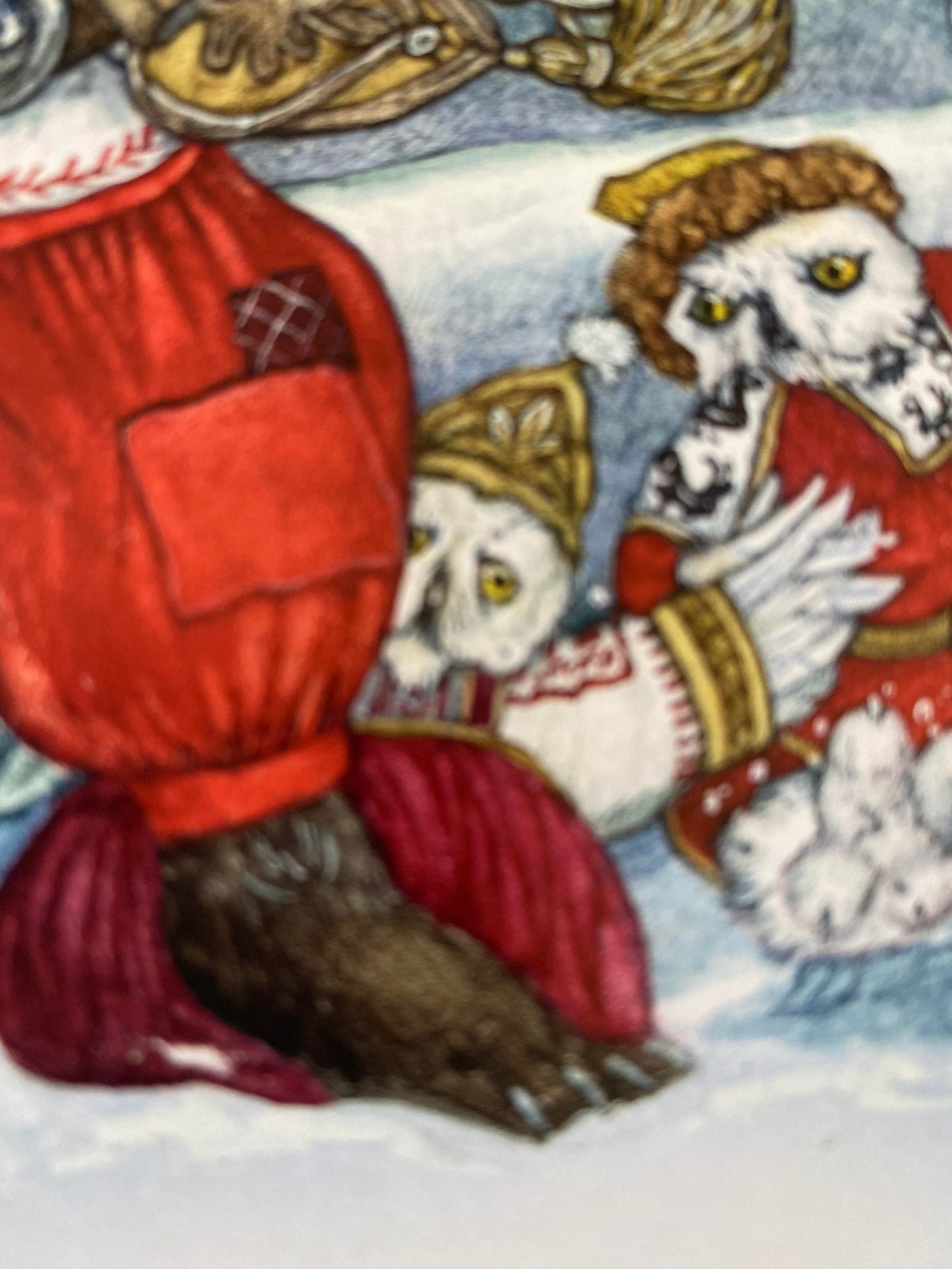 (This lovely reader also asked if she needed to pay for commissioning a dirtbag, to which I replied “God no, who do you think I am, Doris Kearns Goodwin? but if you want to send me something free and amazing please do,” to which she replied with this image of an owl in traditional Russian dress being stepped on by a bear wearing pants: